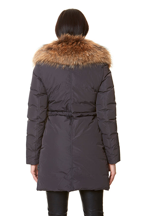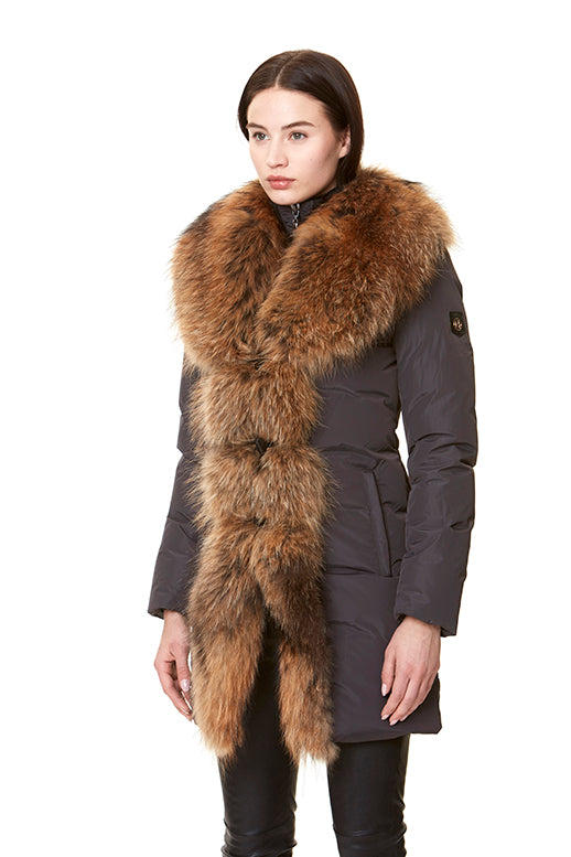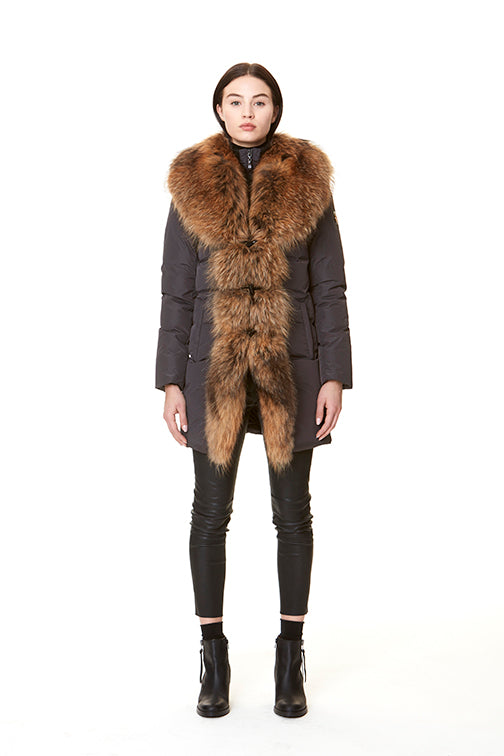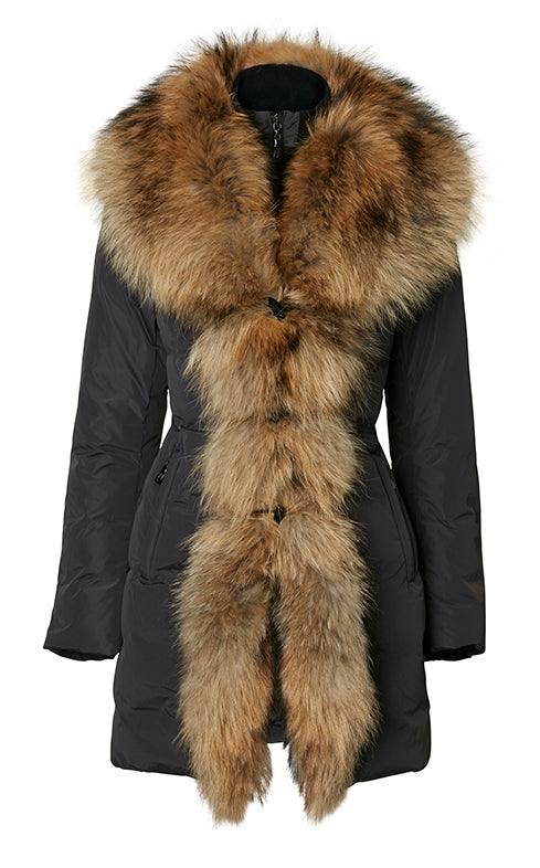 Otroligt lyxig dunjacka i en sober mörkgrå nyans. Stor, vacker pälskant runt halsen som fortsätter ända ner till fållen framtill.
