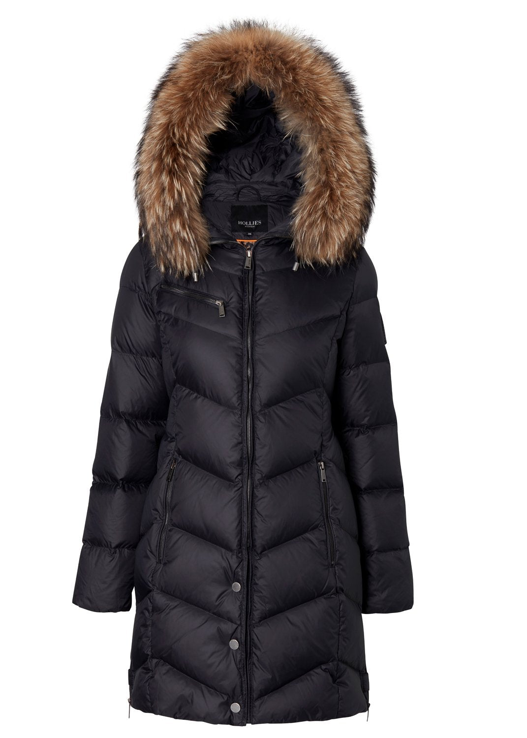Lång svart dunjacka ifrån Hollies med fast monterad huva och avtagbart äkta pälskrage.