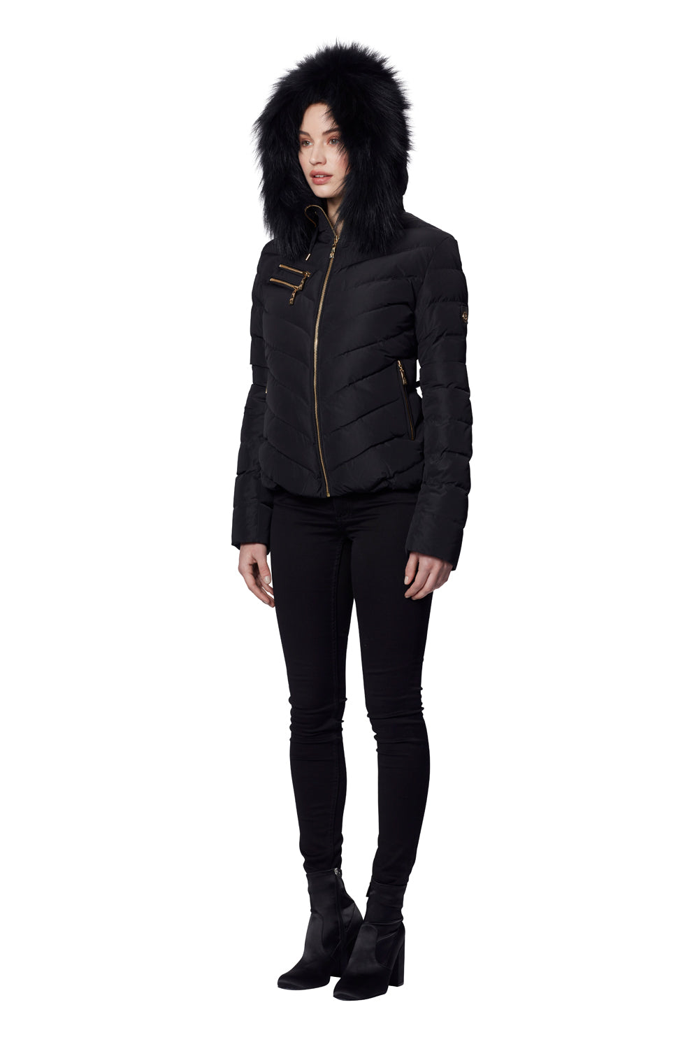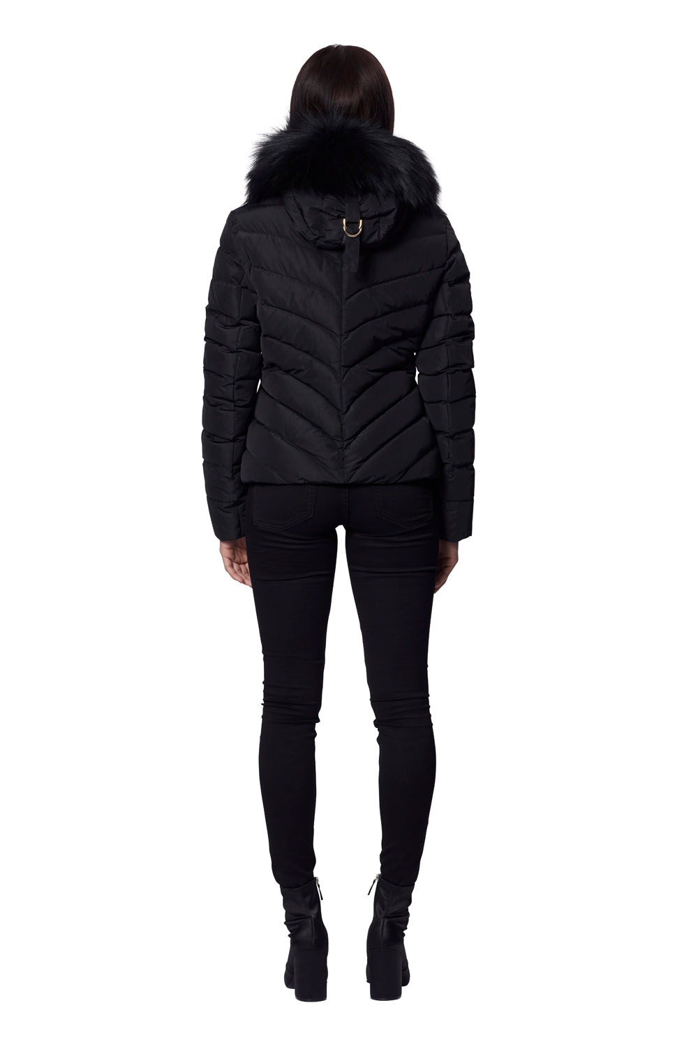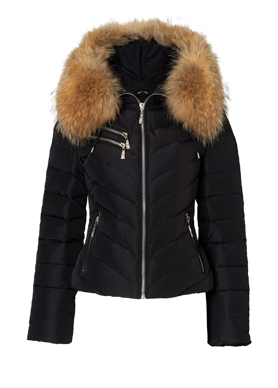 Jackan som är tillverkad i stark och smidig polyester har en fast monterad huva och ett pälsbräm i tvättbjörn som är avtagbart. Jackan i 36 är 92 cm runt bröstet och rygglängden är 55 cm, i storlek 36.