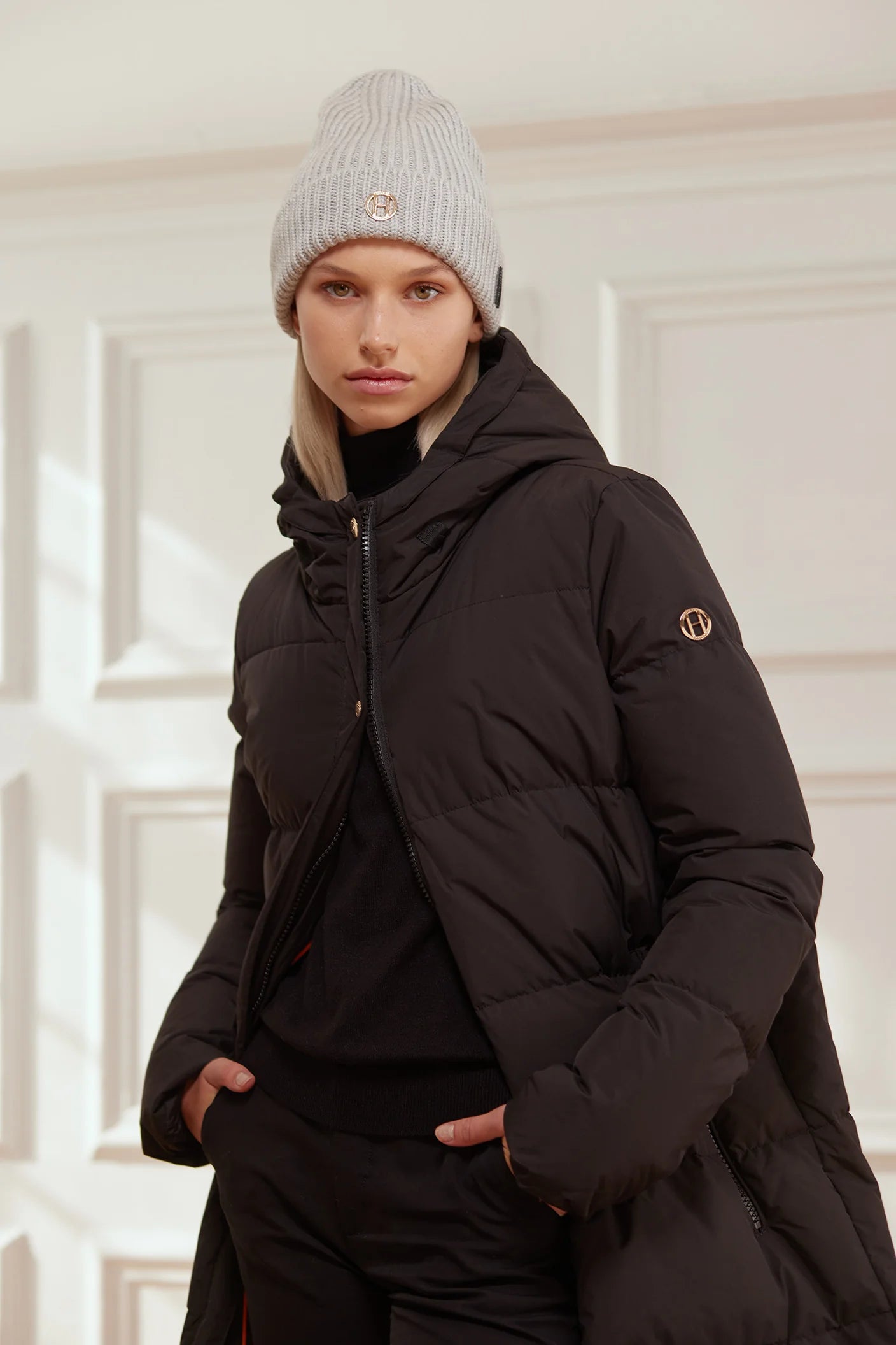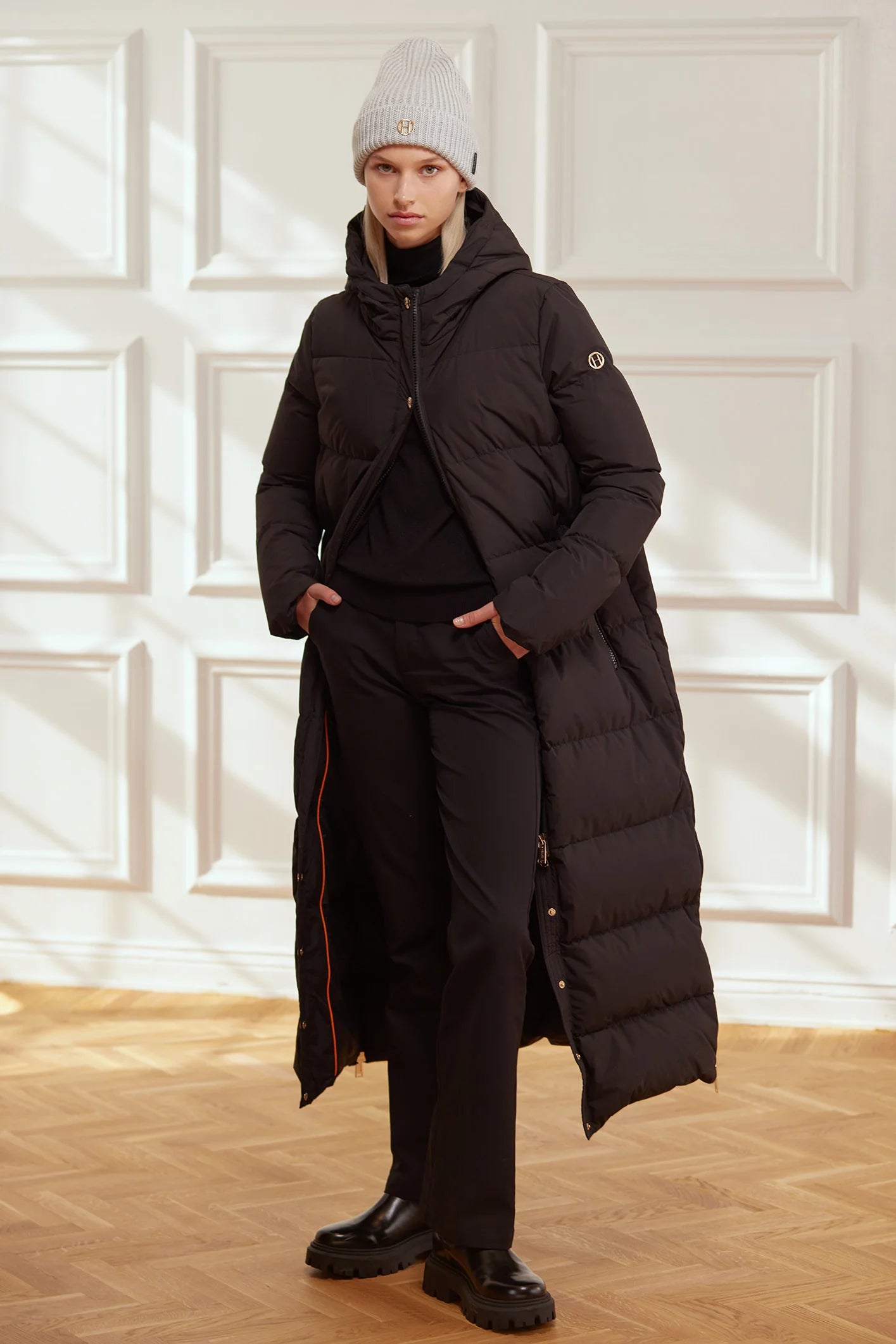 Lång rak dunjacka, stängd med dragkedja framtill, täckt med en stormslå som håller vinden ute. En speciell handsfree-funktion i nacken fram, två tryckknappar som du kan stänga om du inte vill dra ner dragkedjan på kappan. Ni vet om man av någon anledning vill ha kappan öppen men känner sig lite kall och bara vill hålla ihop den. Långa dragkedjor i sidsömmen nedtill. Ribbad mudd på insidan av ärmsluten håller dig extra varm.