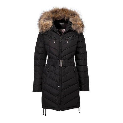 En lång vinter jacka, rygglängden i storlek 36 är 88 cm och bröstvidden är 94 cm. För att lätt kunna promenera och gå uppför trappor har jackan har 28 cm långa sprund i sidorna, vilket går att stänga och öppna med en dragkedja. Dragkedjan i framkanten börjar också 28 cm upp från nederkanten, man kan dock knäppa till jackan hela vägen ner med tryckknappar. Jackan är tillverkad i polyester med en skön varm fyllning av polyster / Sorona . Det finns ett resårstickat bälte i midjan, och ärmen avslutas på insidan med en 6 cm bred trikå resår runt handleden. Huvan är och fast monterad går att justera i höjd, med en spänntamp bak. Den snygga oäkta pälsen sitter som ett bräm runt huvan och är avtagbart. Jackan har två lodräta fickor i sidsömmarna fram och två mindre fickor på bröstet, alla stängs med dragkedja. Dragkedjan fram skyddas på undersidan av en knappslå. Jackan är smakfullt fodrad med ett leopard mönstrat foder i brunt och svart, och det finns en öppen innerficka på vänster bröstsida, vilken man kan stänga med en kardborreknäppning.