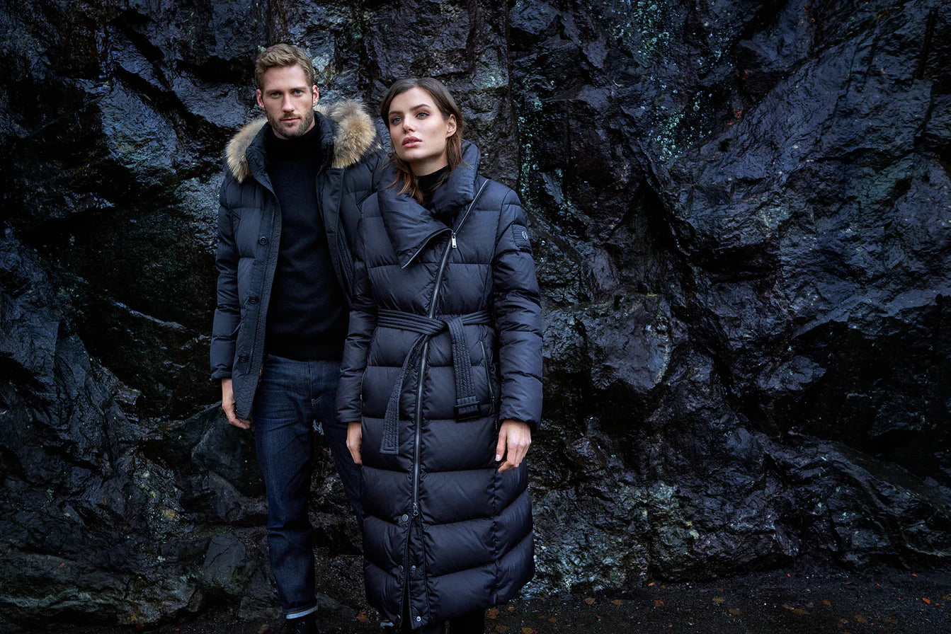 The down-filled jacket has a form-fitted, flattering silhouette waterfall collar in a bit lighter quality. Two side pockets and one pockets on the right chest. Soft, semi-shiny, and water-repellent outer fabric. Decorative Hollie's brand label on the left sleeve. Equipped with an easily accessible phone pocket with velcro closing on the left inside.