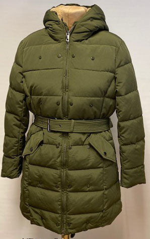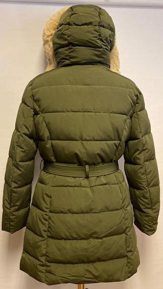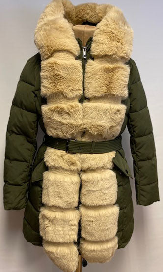 En otroligt lyxig dunjacka i grön, fint material. Stor, vacker fusk pälskant runt halsen som fortsätter ända ner till fållen framtill.