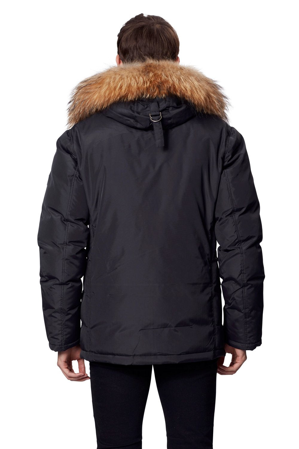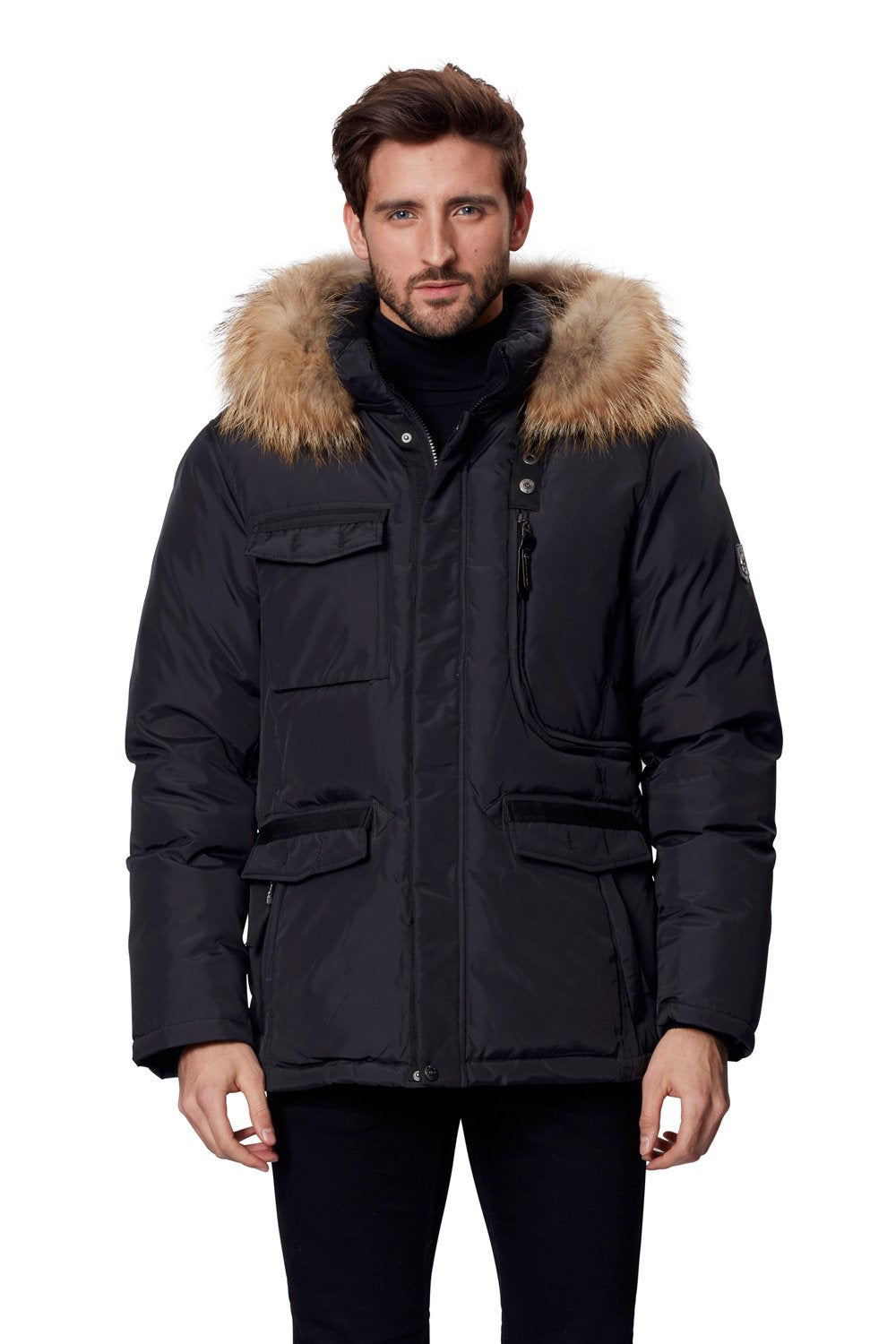 Material: Outer / inner shell 100% polyester, filling 80% duck down and 20% duck feather genuine, 100% Raccoon fur. Water-repellent.