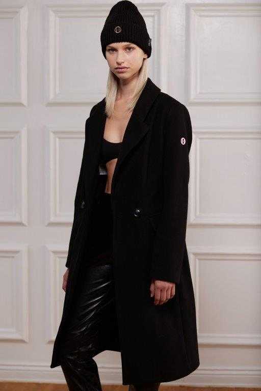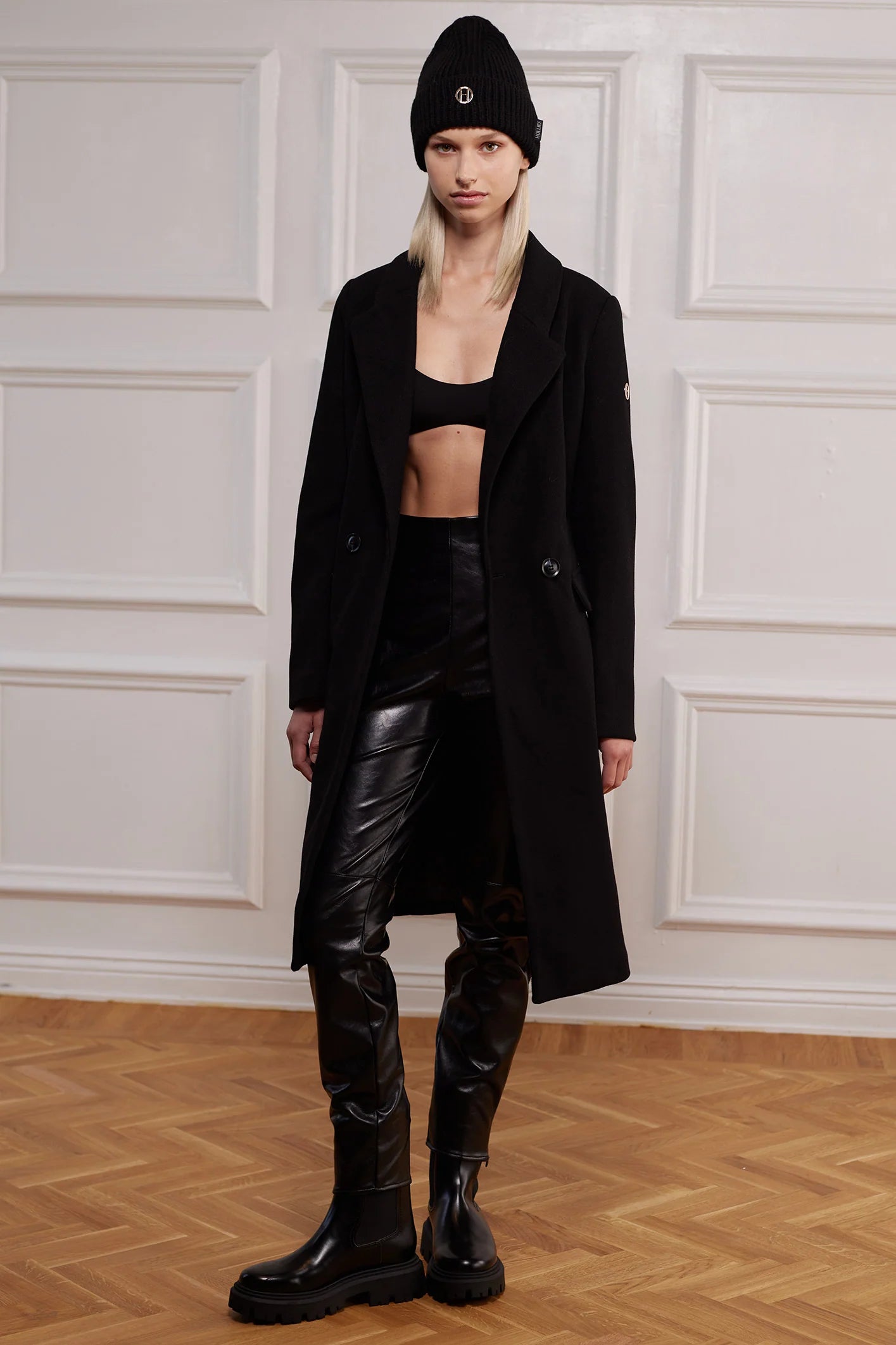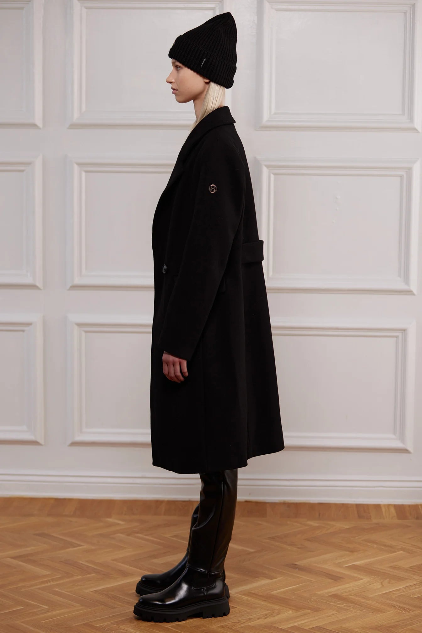 Megan är en skräddarsydd klassisk kappa med kavaj och krage. Stängs med 2 knappar i midjan.