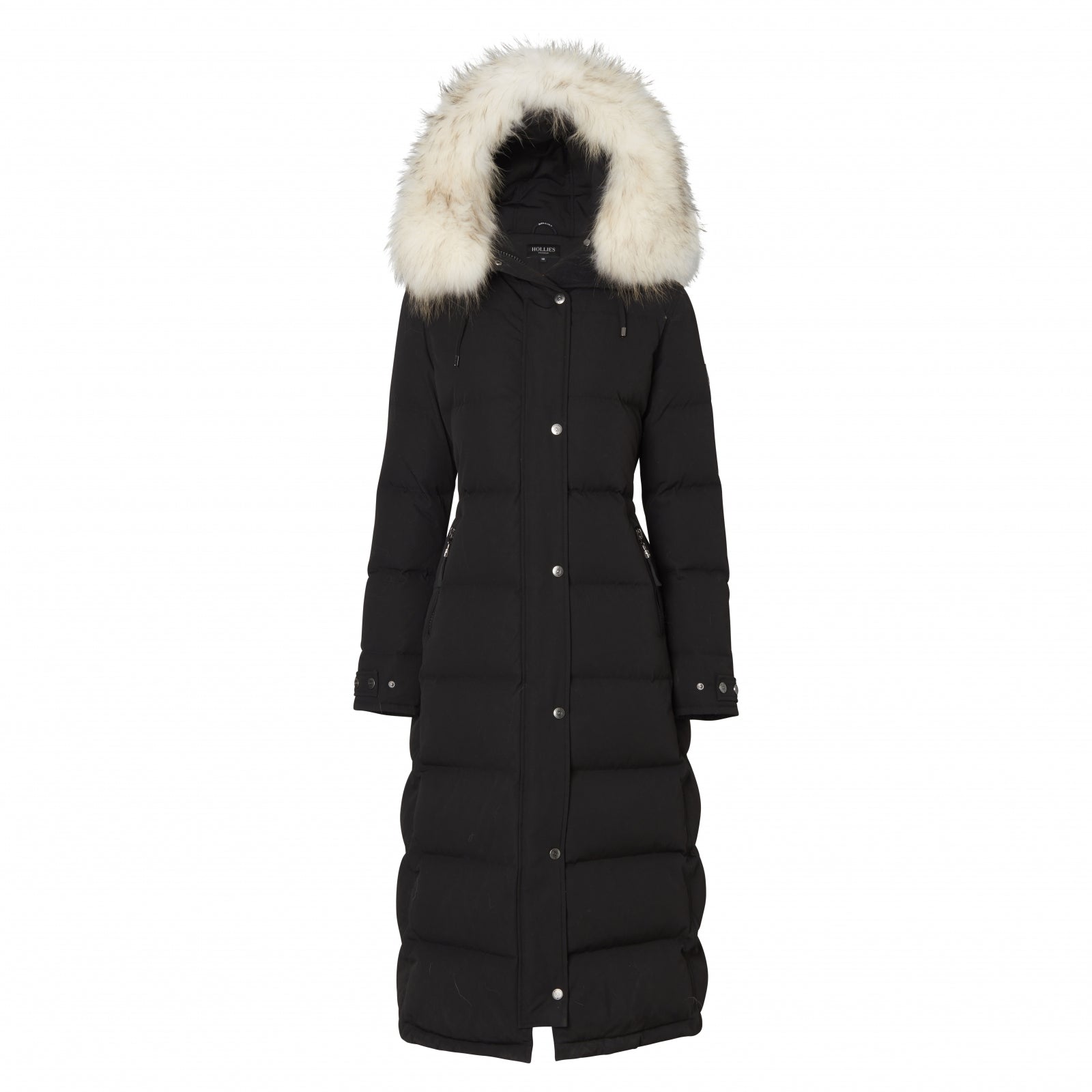 Årets snyggaste vinterjacka är från Hollies! Jackan är tillverkad i ett kraftigt och slitstarkt tyg med blandningen 90% polyester och 10% nylon, fodret är svart polyester. Fyllningen är 80% dun och 20% fjäder, vilket ger en bra värmeisolation. Huvan är fast monterad och går att justera i höjdled med en spänntamp uppe på huvan. Huvan är också justerbar men ett tunnare band i framkanten. Pälskragen som är äkta tvättbjörn är avtagbart med små knappar. Den kraftiga tvåvägs dragkedjan fram går att dra upp hela vägen upp över hakan.