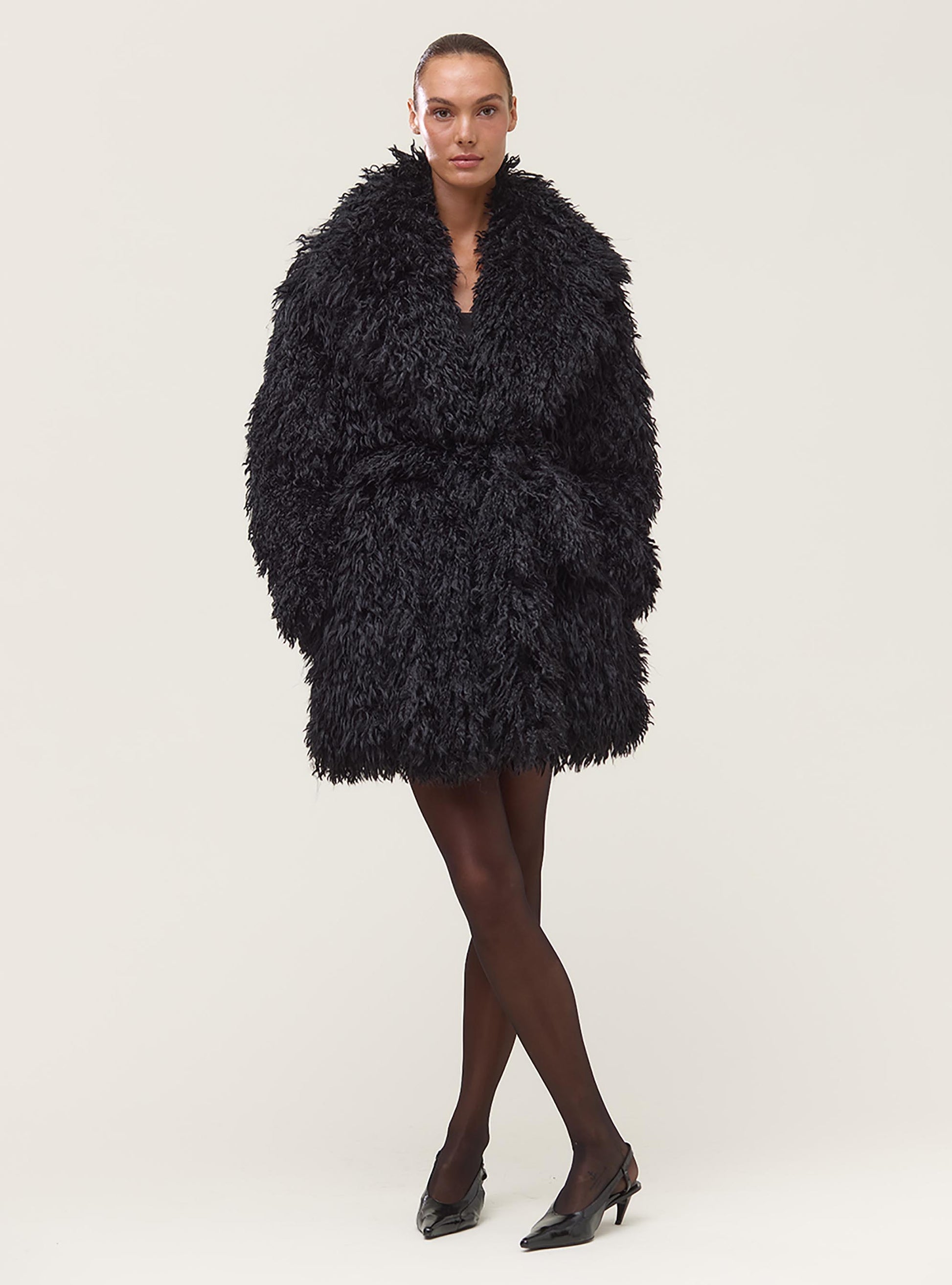 Nadja-kappan är tillverkad i fuskpäls. Kappan stängs med pälsknappar och fickor i sidsömmen. Bälte i midjan ger en feminin silhuett.