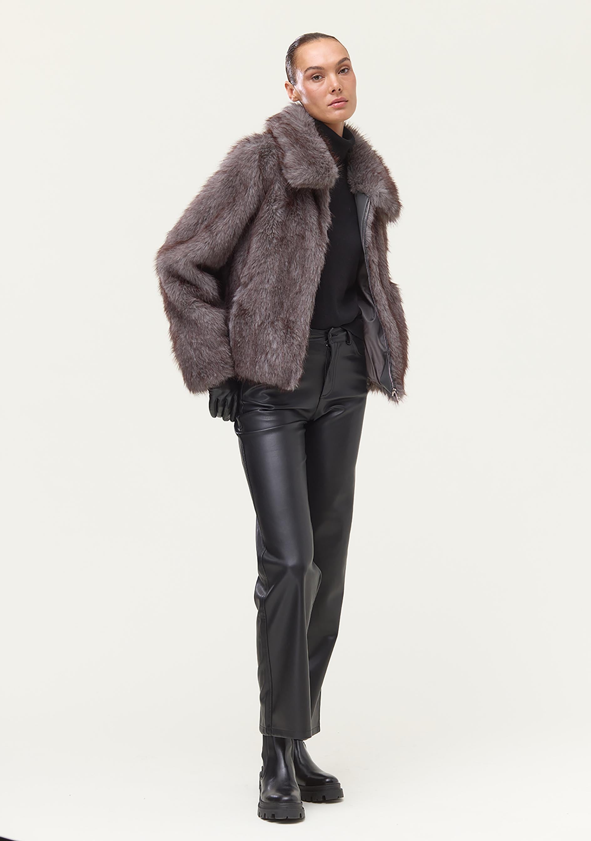 Robbie är en kort fuskpälsjacka. Stängs med dragkedja.