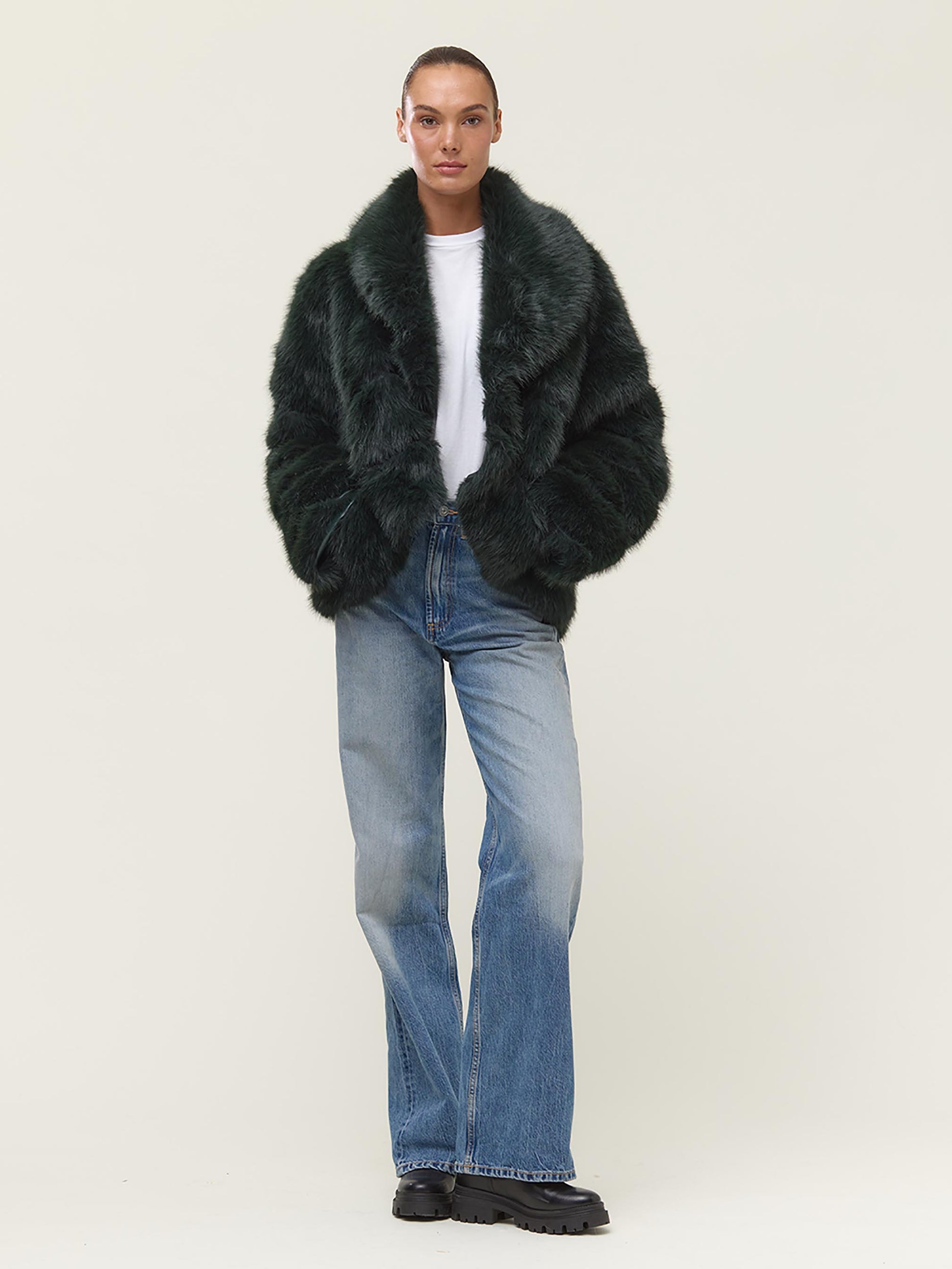 Rose är en kort fuskpälsjacka med framfickor. Stängs med pälsknappar.