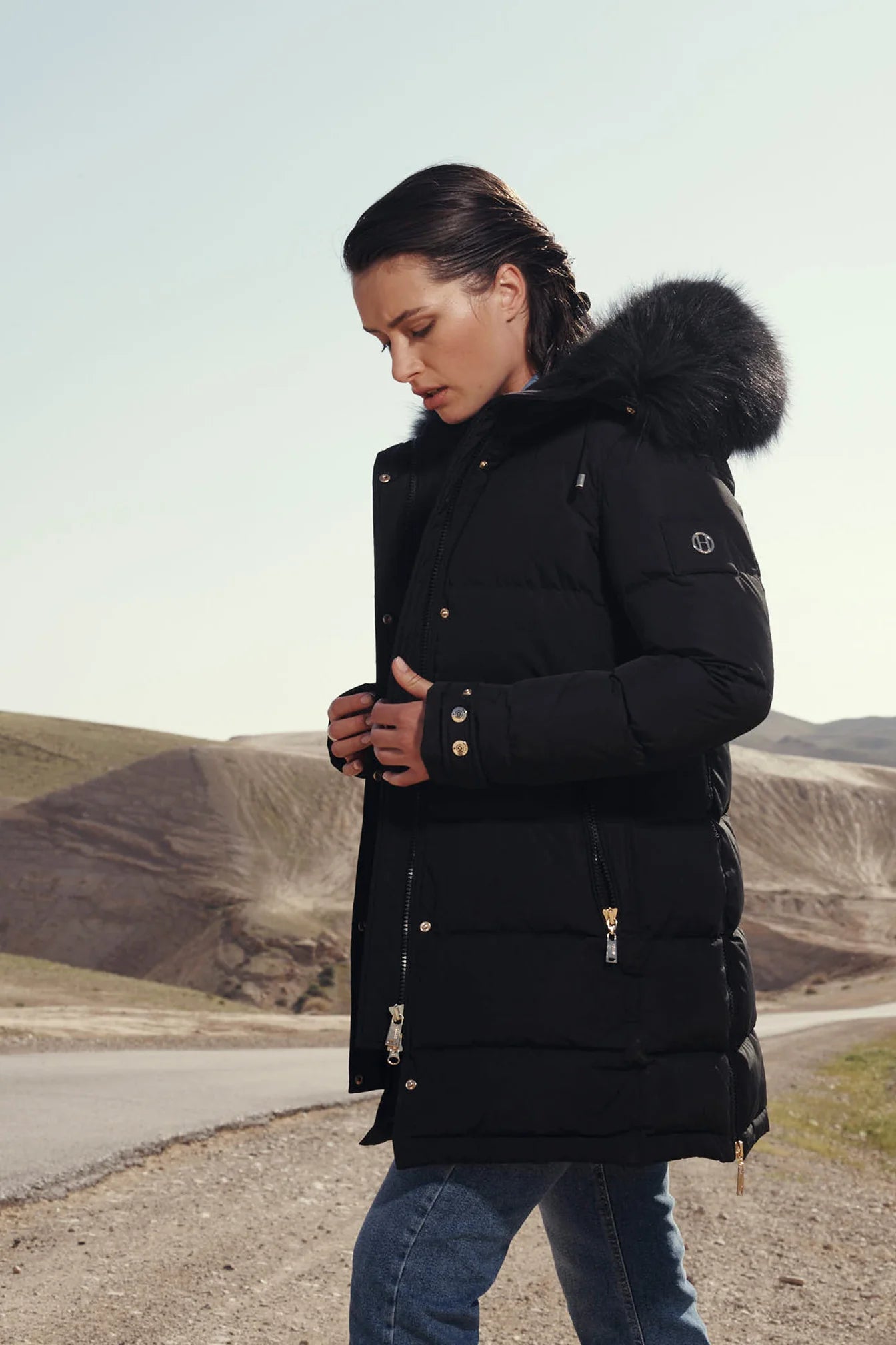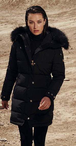 Jackan är tillverkad i ett kraftigt och slitstarkt tyg med blandningen 90% polyester och 10% nylon, fodret är svart polyester. Fyllningen är 80% dun och 20% fjäder, vilket ger en bra värmeisolation. Huvan är fast monterad och går att justera i höjdled med en spänntamp uppe på huvan. Huvan är också justerbar men ett tunnare band i framkanten. Pälsbrämet som är äkta tvättbjörn är avtagbart med små knappar och kan tvättas för hand i in mild tvållösning. Dunjackan skall vattentvättas i maskin och torktumlas med flera tennisbollar tills dess att den är absolut torr. Jackan har två varmfodrade sidfickor fram , som man stänger med en kraftig dragkedja. Den kraftiga tvåvägs dragkedjan fram går att dra upp hela vägen upp över hakan och tryckknappar i guldfärg.