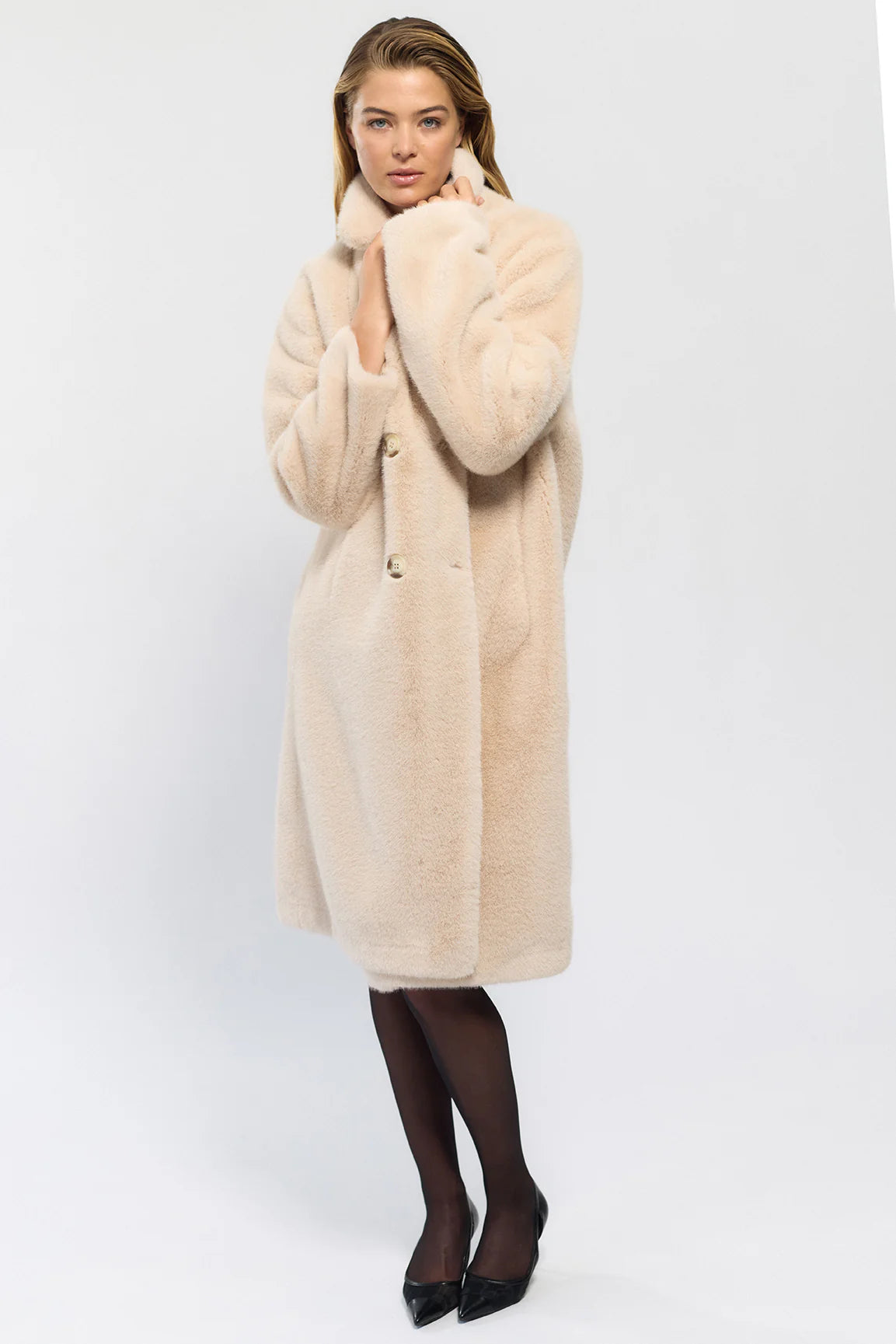 Teddy bear is double breasted, faux fur shearling unlined coat.
