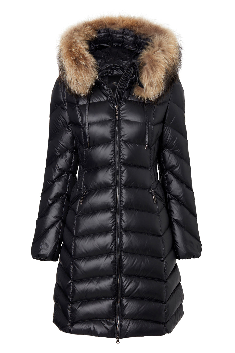 Snygg figursydd jacka med smickrande silhuett och glänsande svart material. En längre modell som verkligen håller dig varm hela vintern. Den mysiga huvan kan anpassas med en rem och har en avtagbar, naturfärgad päls. Två sidfickor med blixtlås. Mjukt och vattenavvisande yttertyg. Hollies logga på vänster ärm. Utrustad med en lättillgänglig telefonficka med kardborreband inuti jackan.