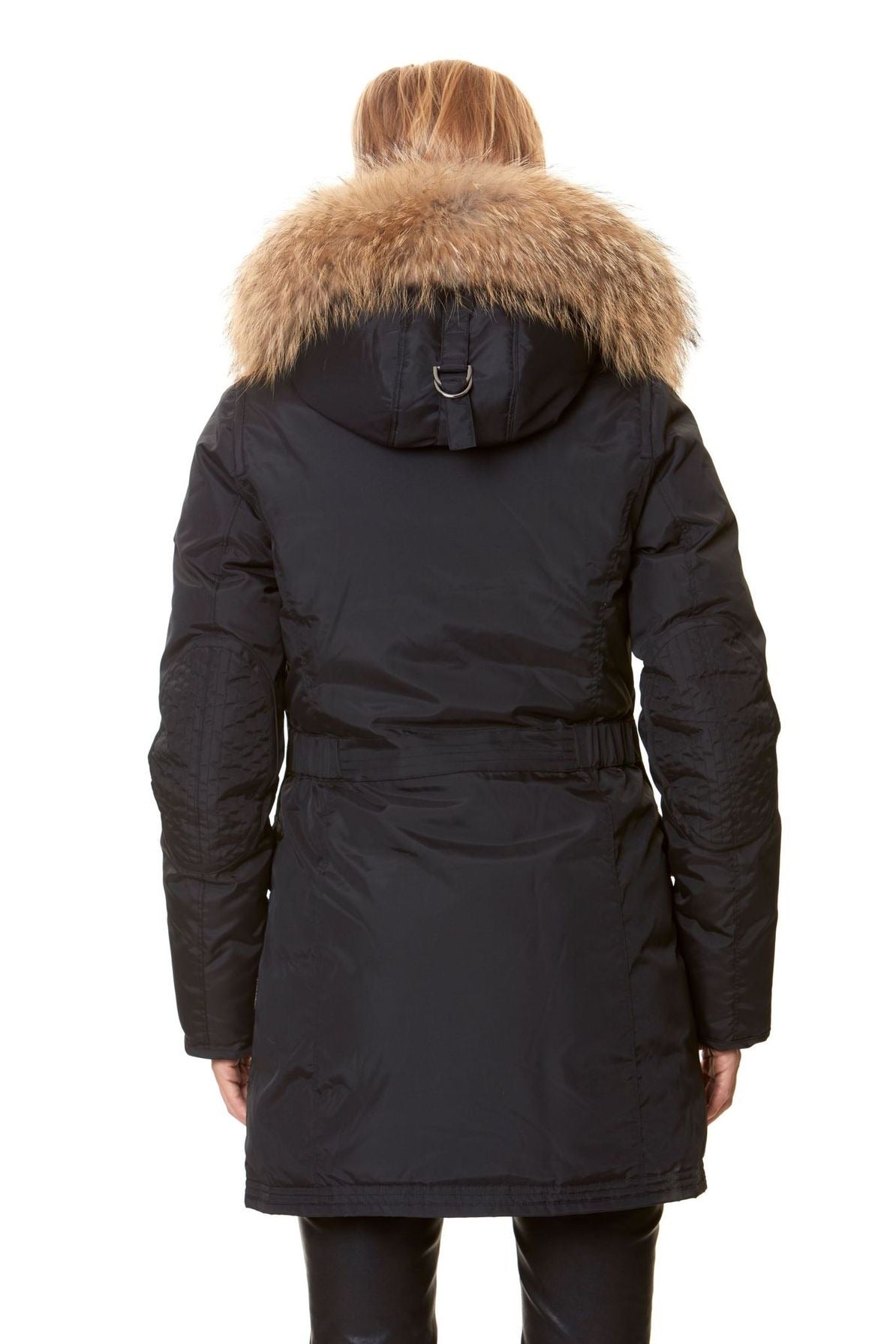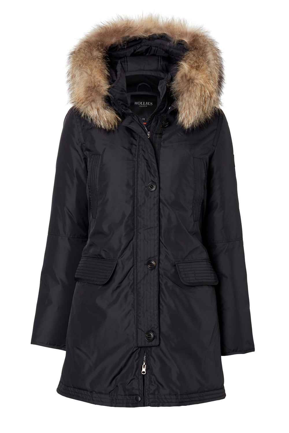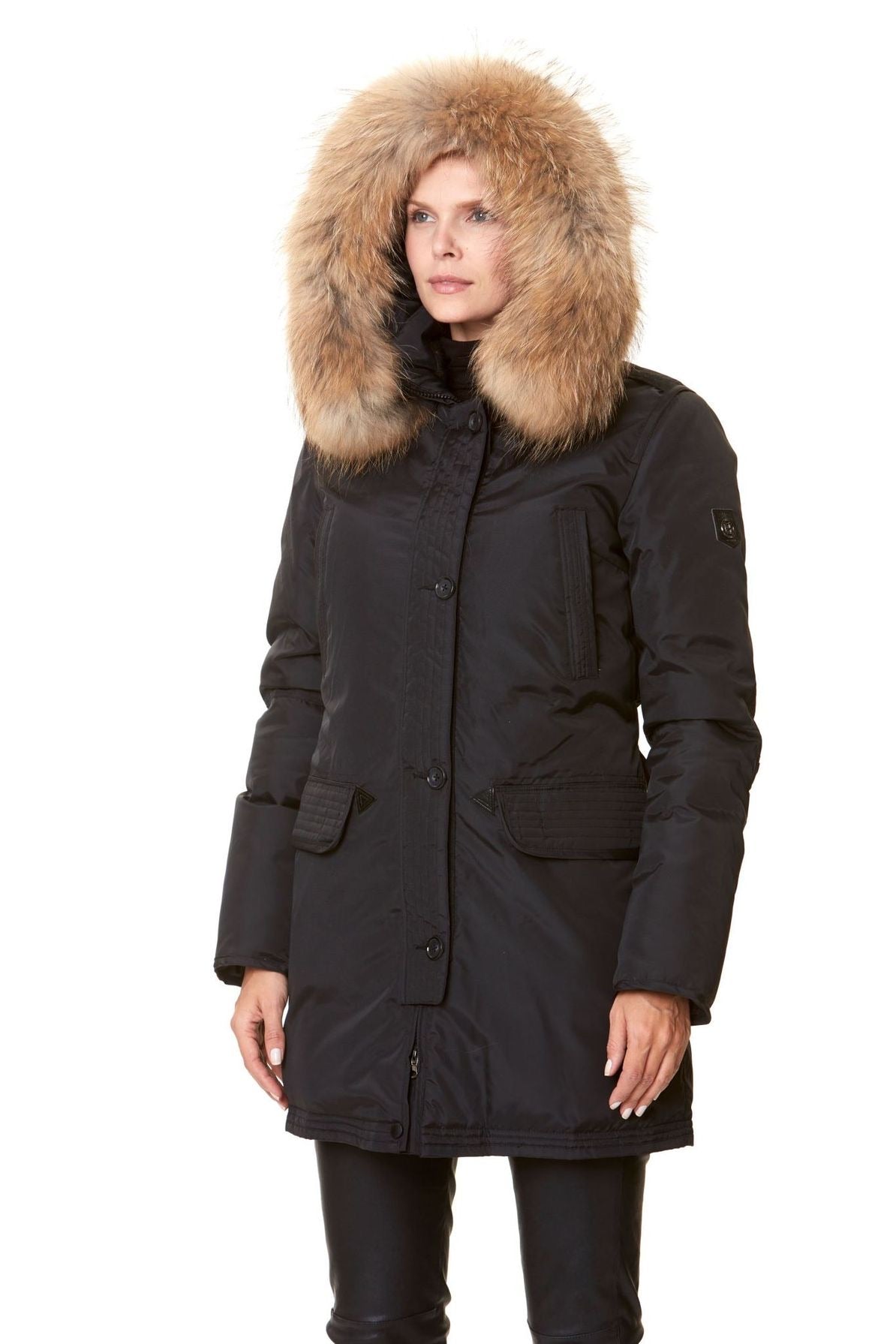 Fin dunfylld vinterjacka med pälskantad huva. Två fickor framtill samt två bröstfickor. Stängs med blixtlås mitt fram samt knappslå.