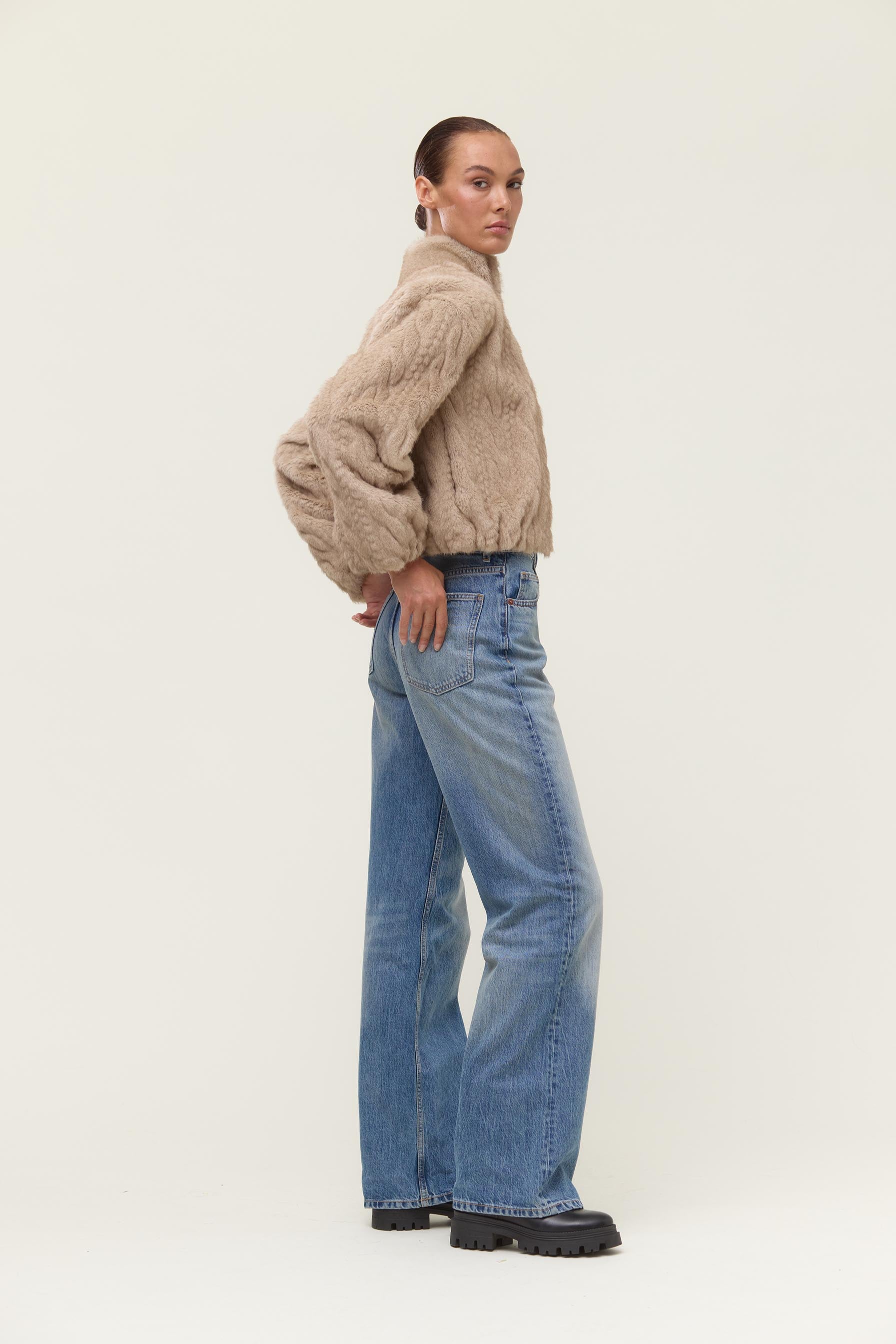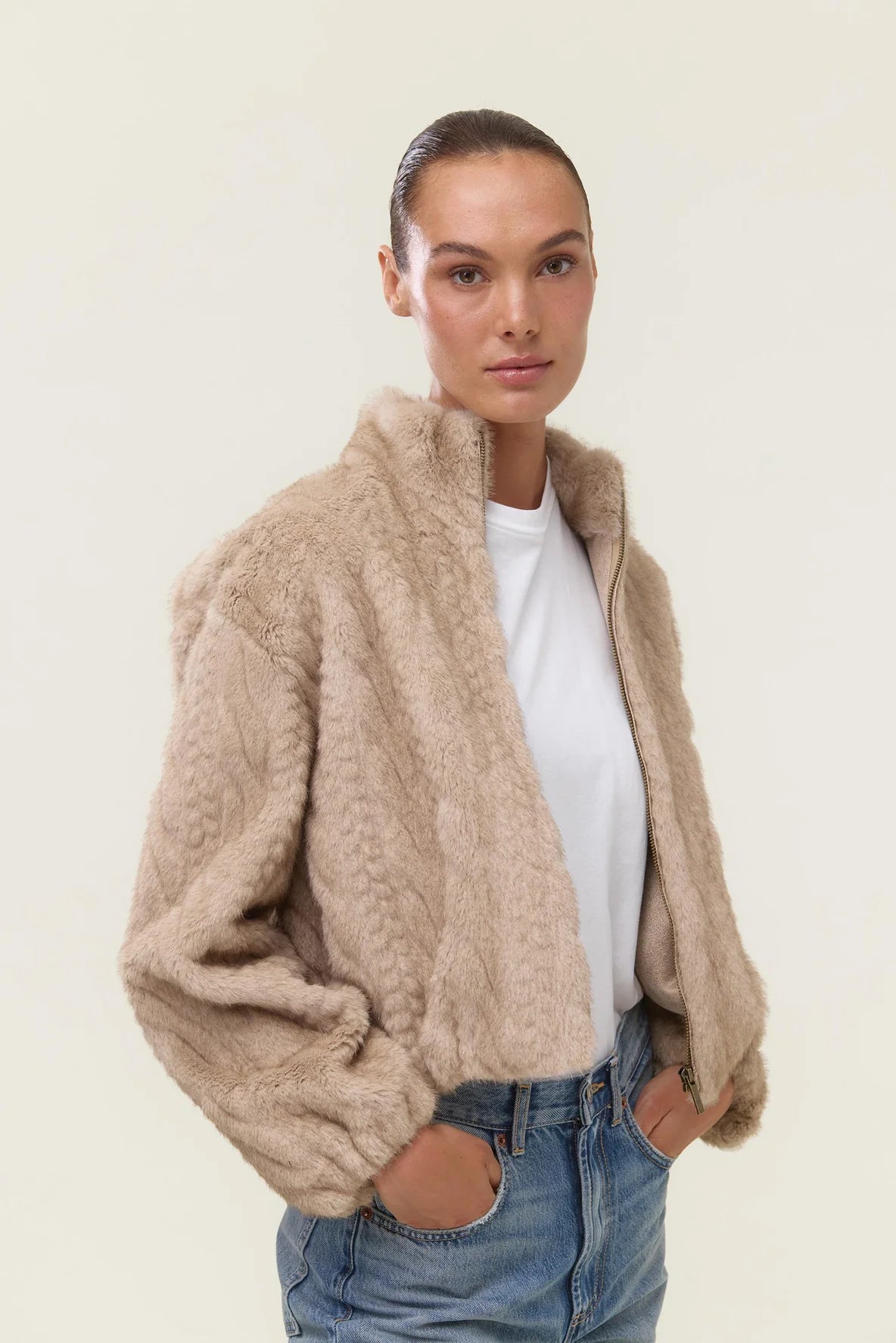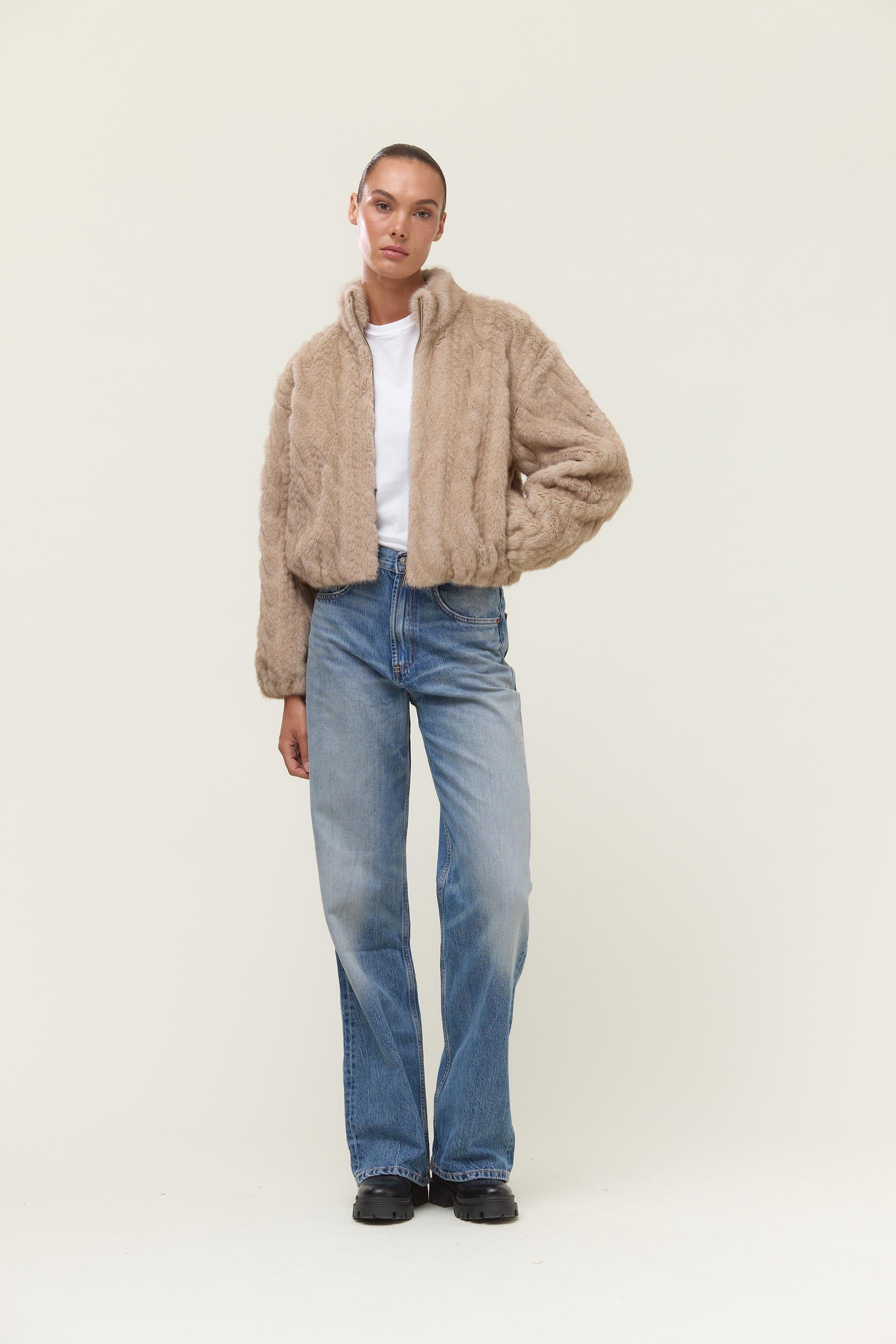 Jenny är en kort jacka med dragkedja framtill i fuskpäls, ofodrad.