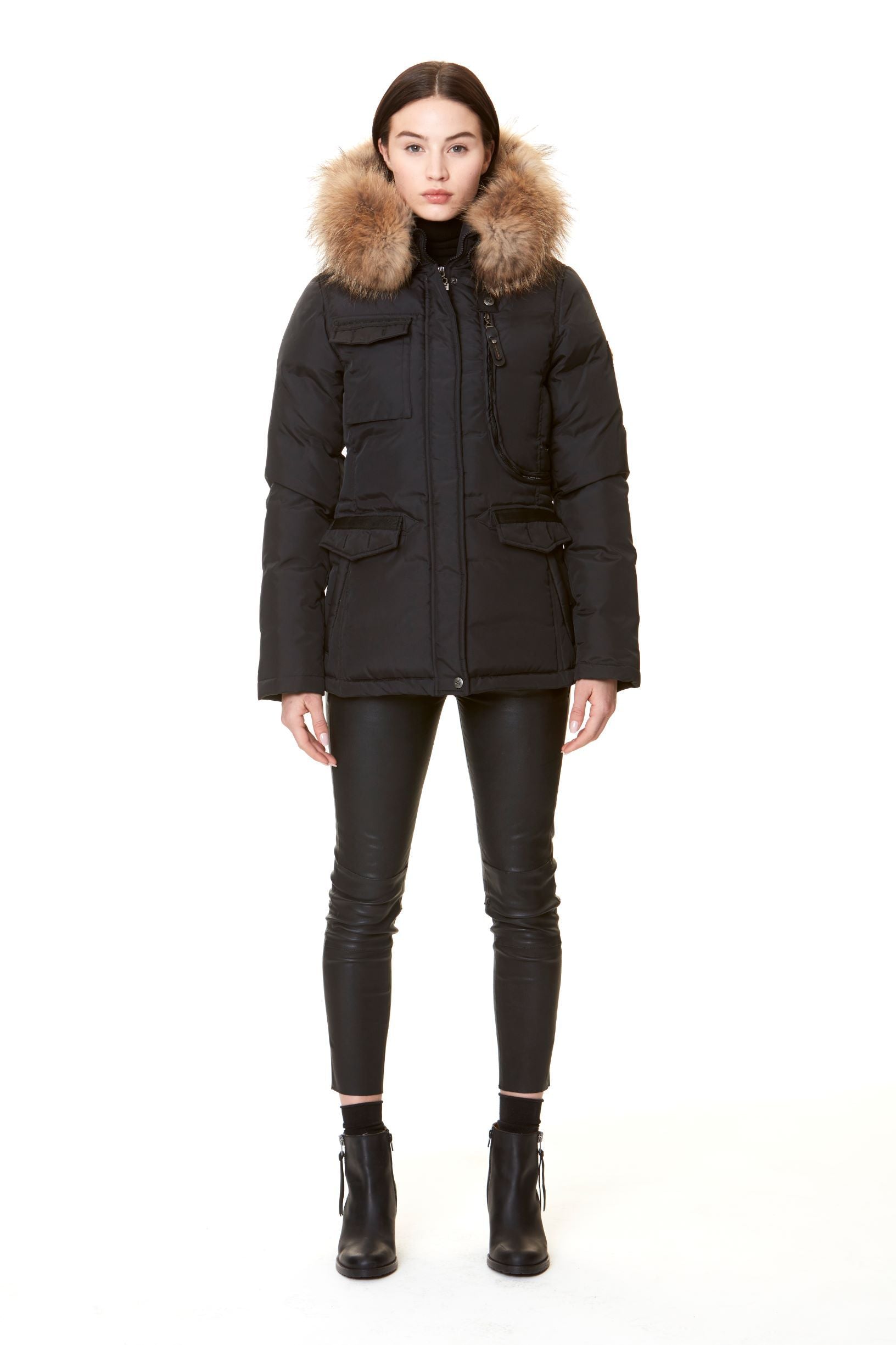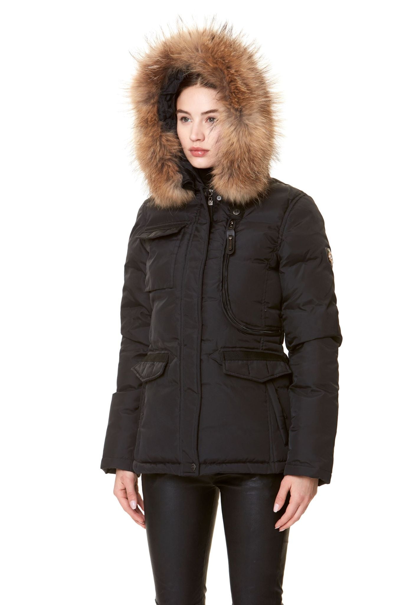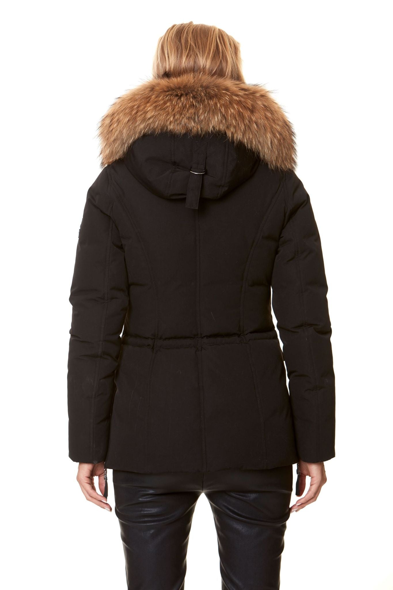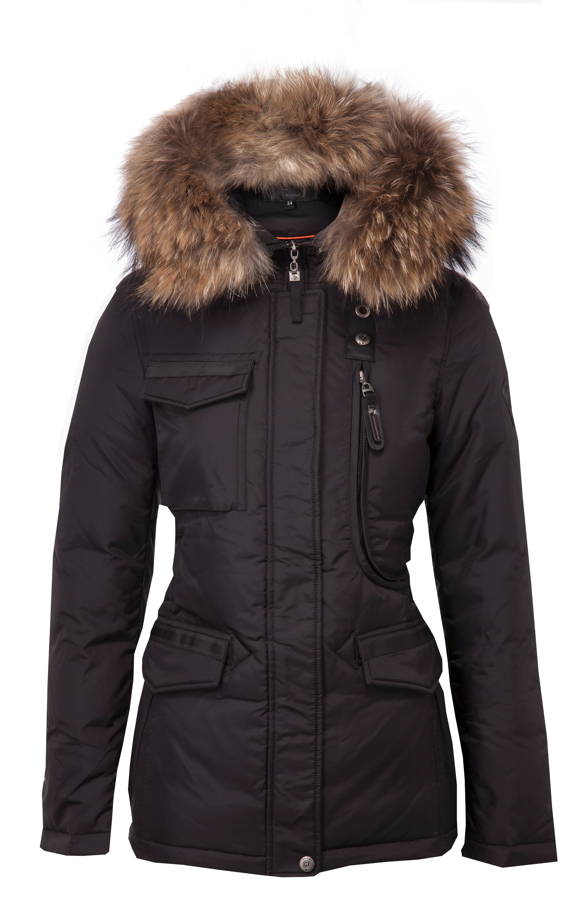 Svart dunjacka med avtagbar luva och med äkta pälskrage runt luvan.