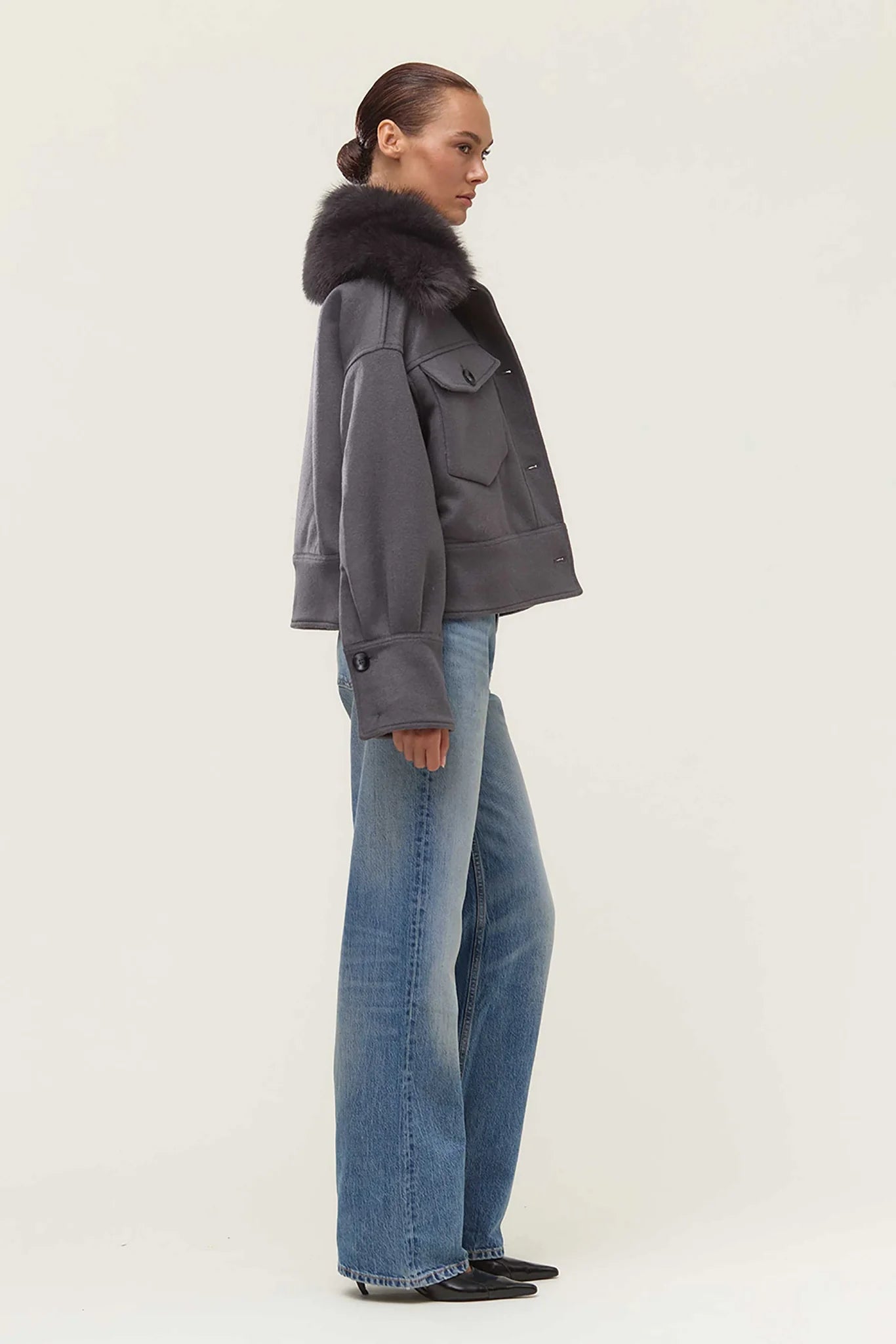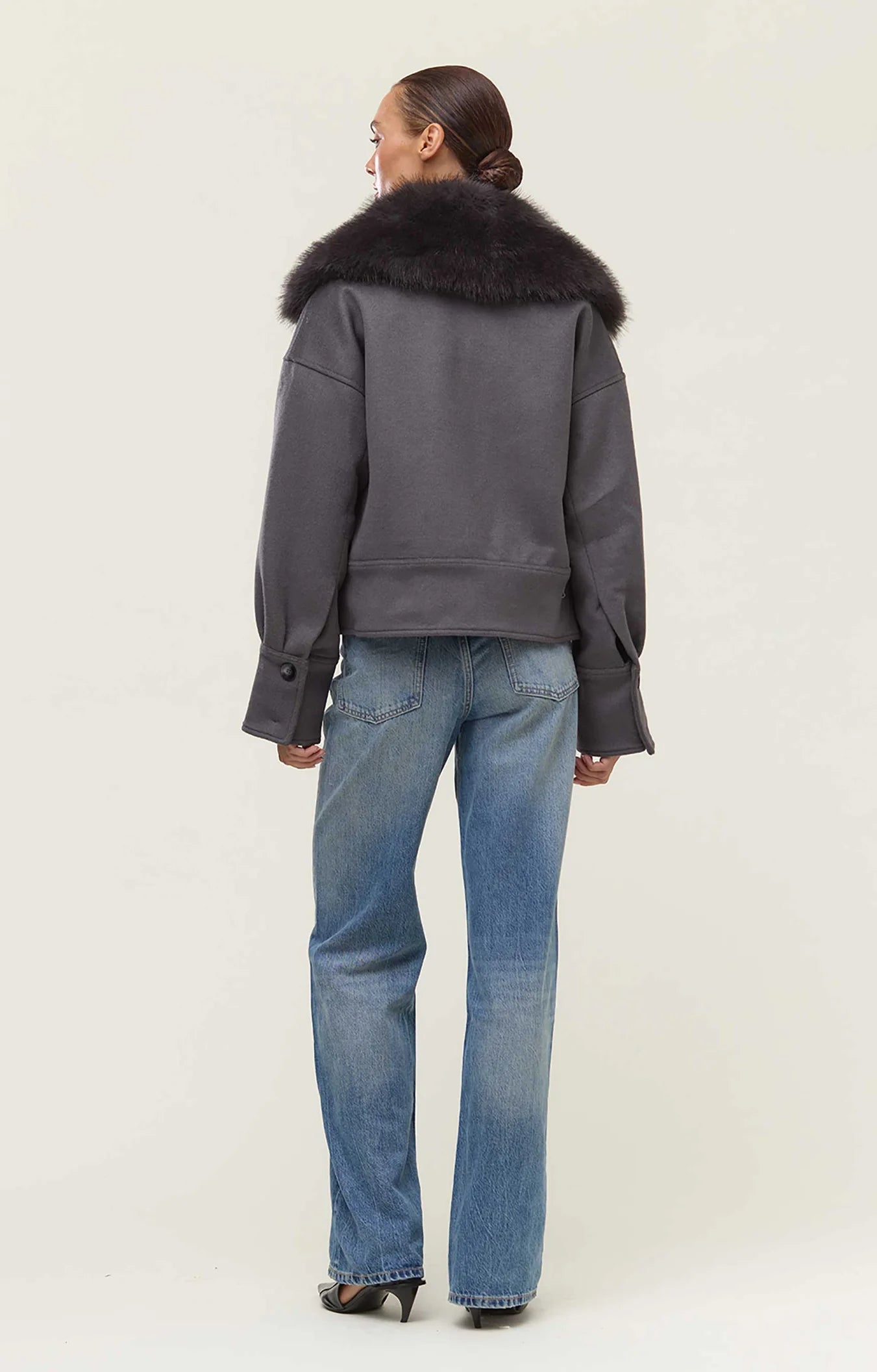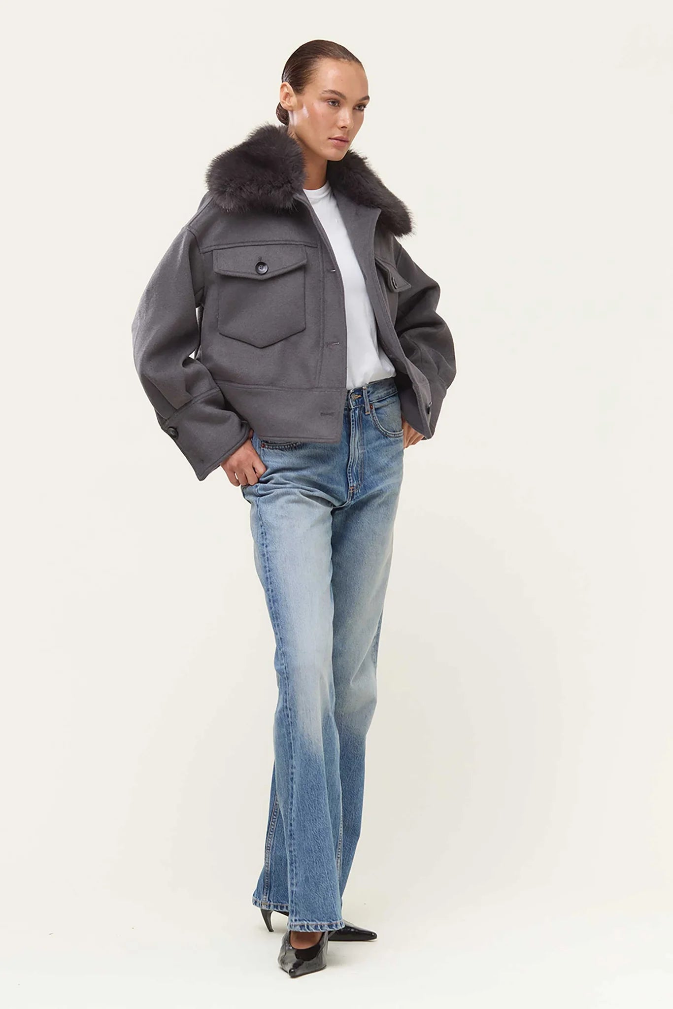 London är en ulljacka med avtagbar krage i fuskpäls och lappade bröstfickor.