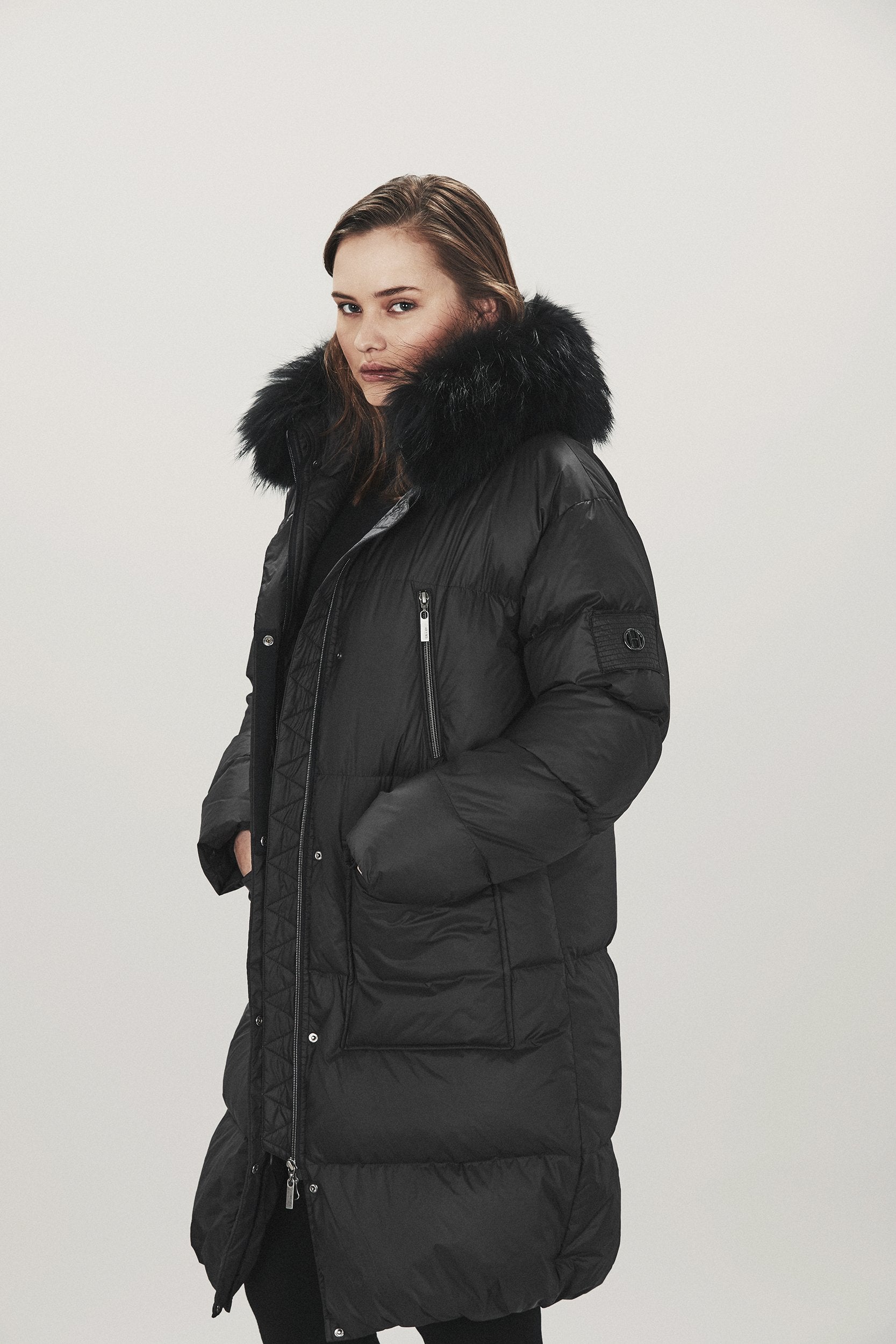 Svart avtagbar pälskrage fäst på en justerbar luva.