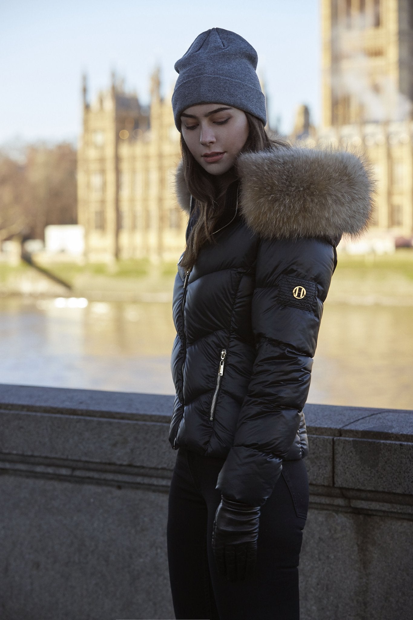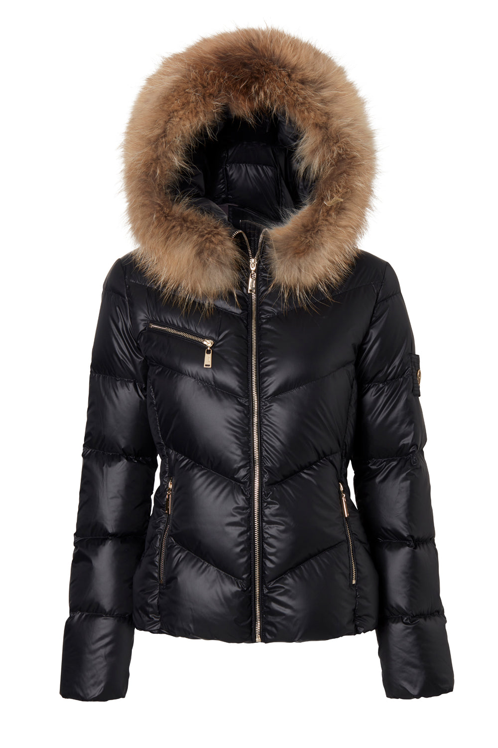 Svart semiglansig dunjacka med guldiga blixtlås och avtagbar pälskrage på luvan. Två sidofickor och en bröstficka.