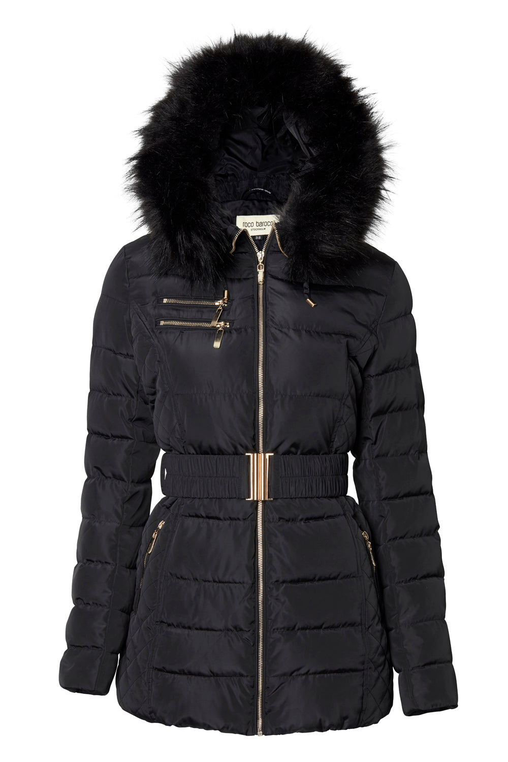 Snygg vinterjacka i en figurnära modell med en avtagbar svart fuskpälskrage.