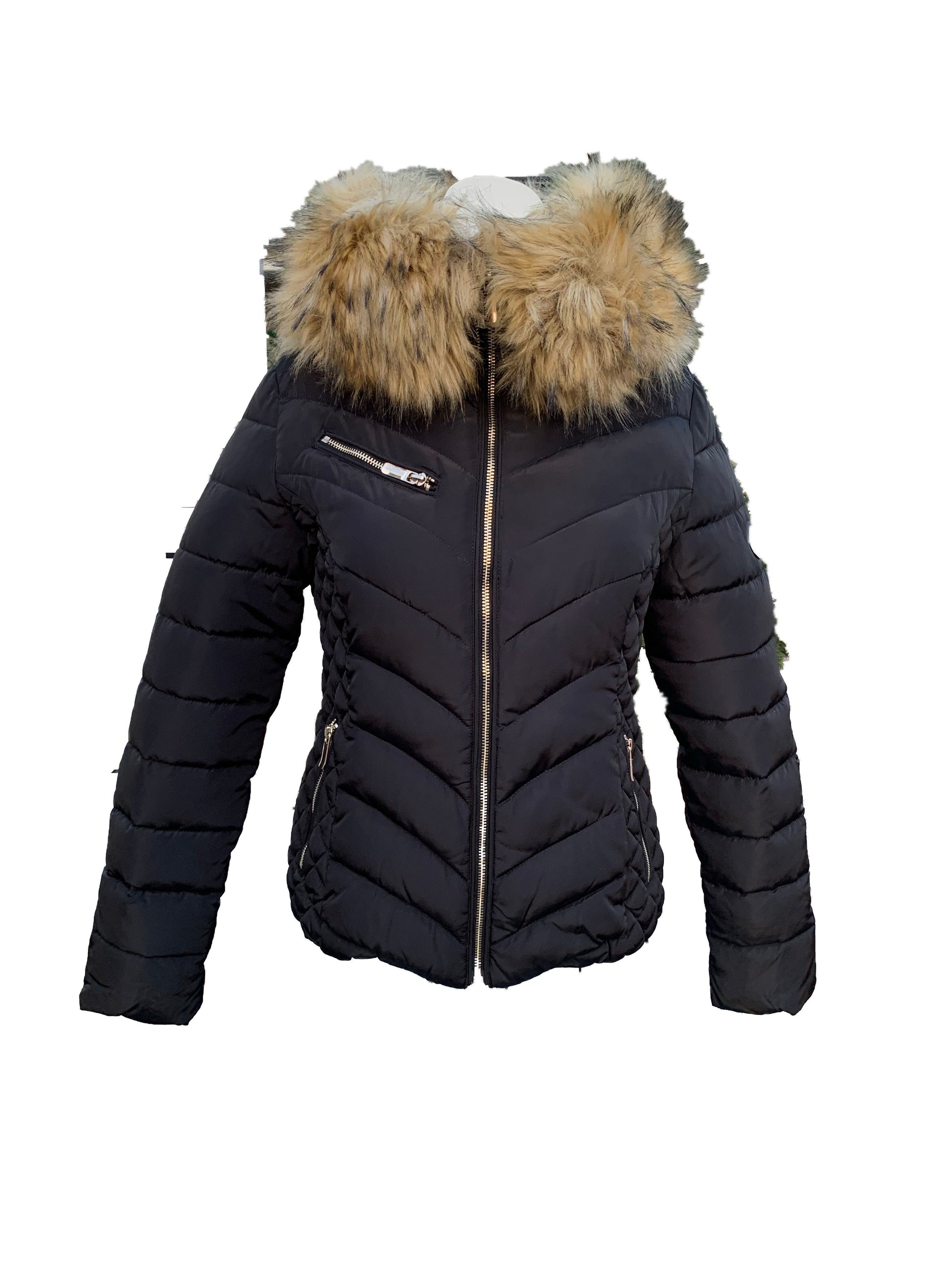 Jackan har en luva och fuskpäls som går att knäppa bort.