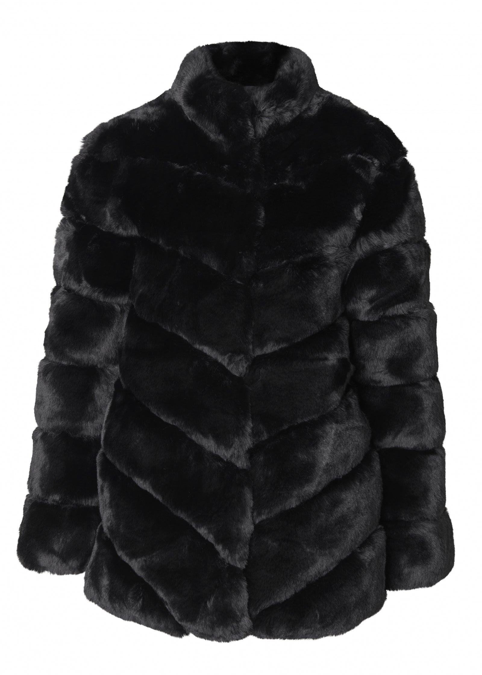 Lite längre jacka i svart fuskpäls, med tryckknappar, från svenska Hollies.