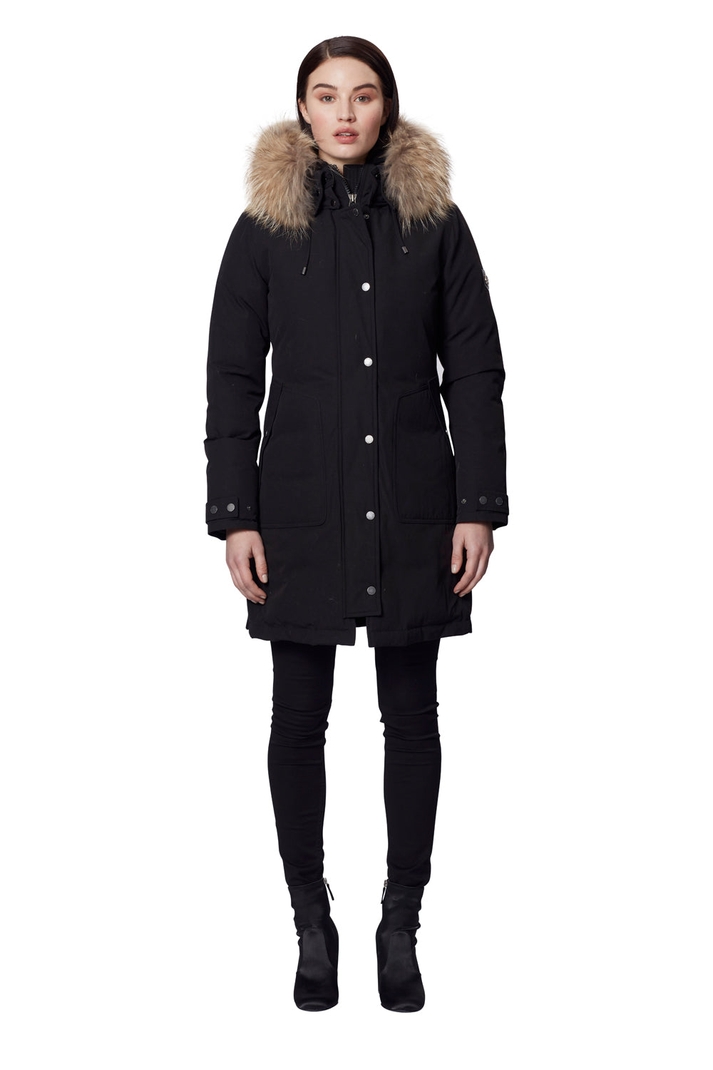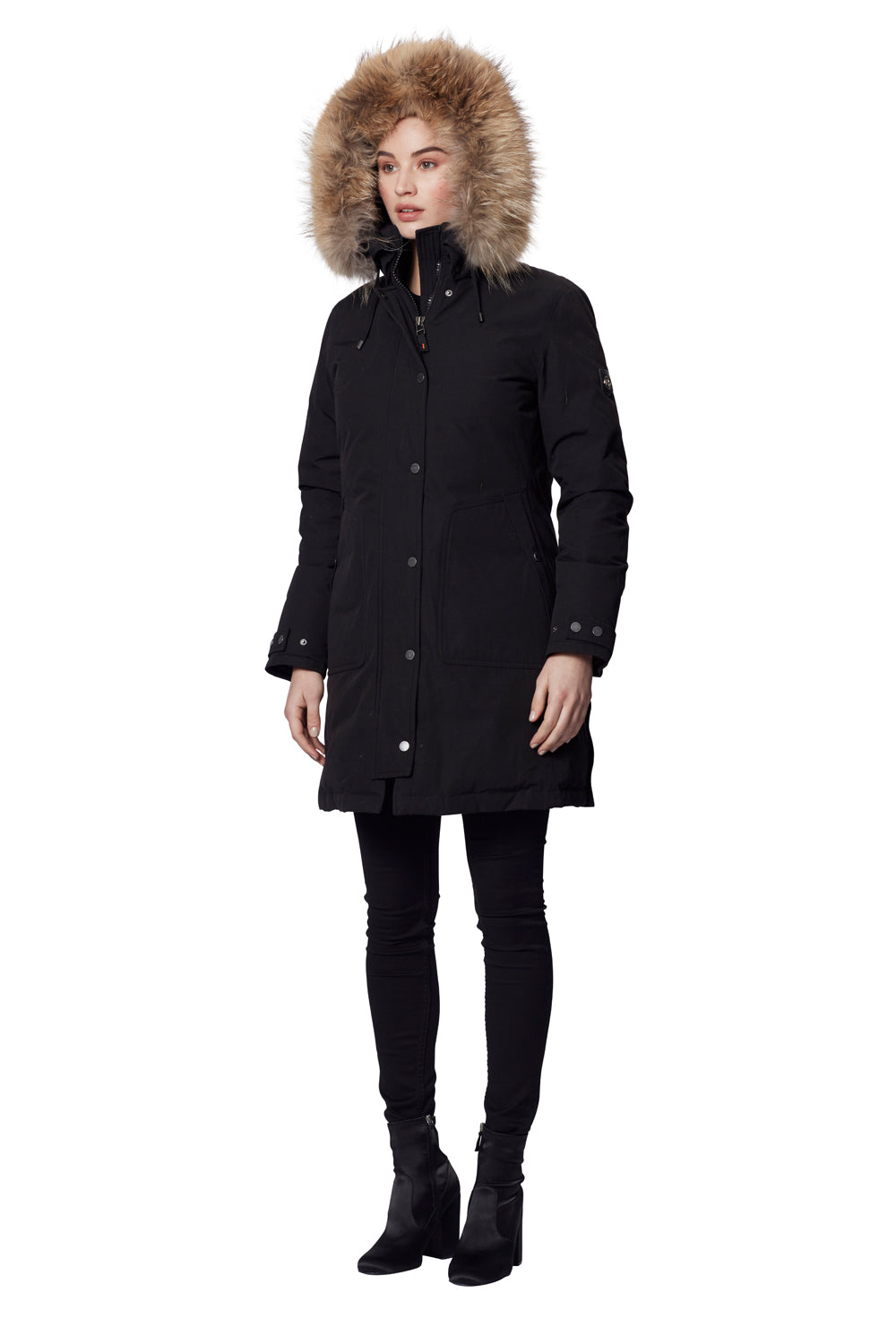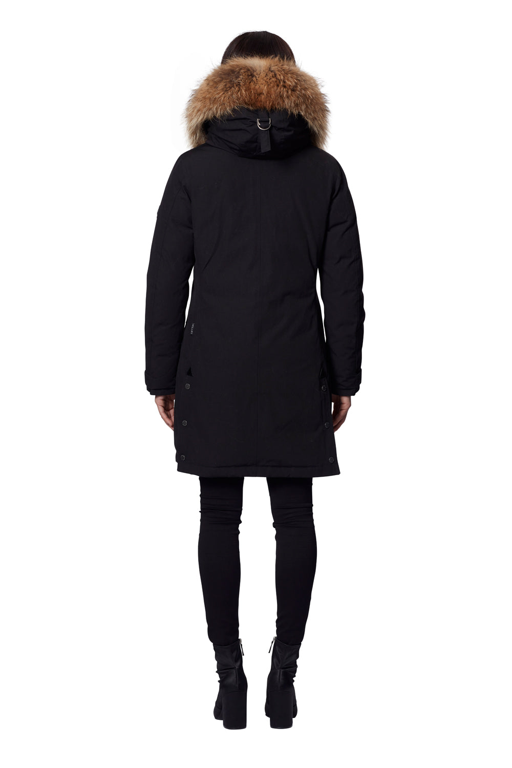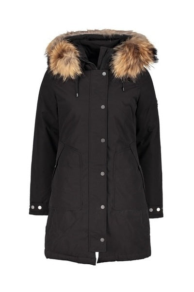 Svart dunjacka i en lite längre modell. Knappslå och dolt blixtlås framtill. Luva med avtagbar pälskrage.